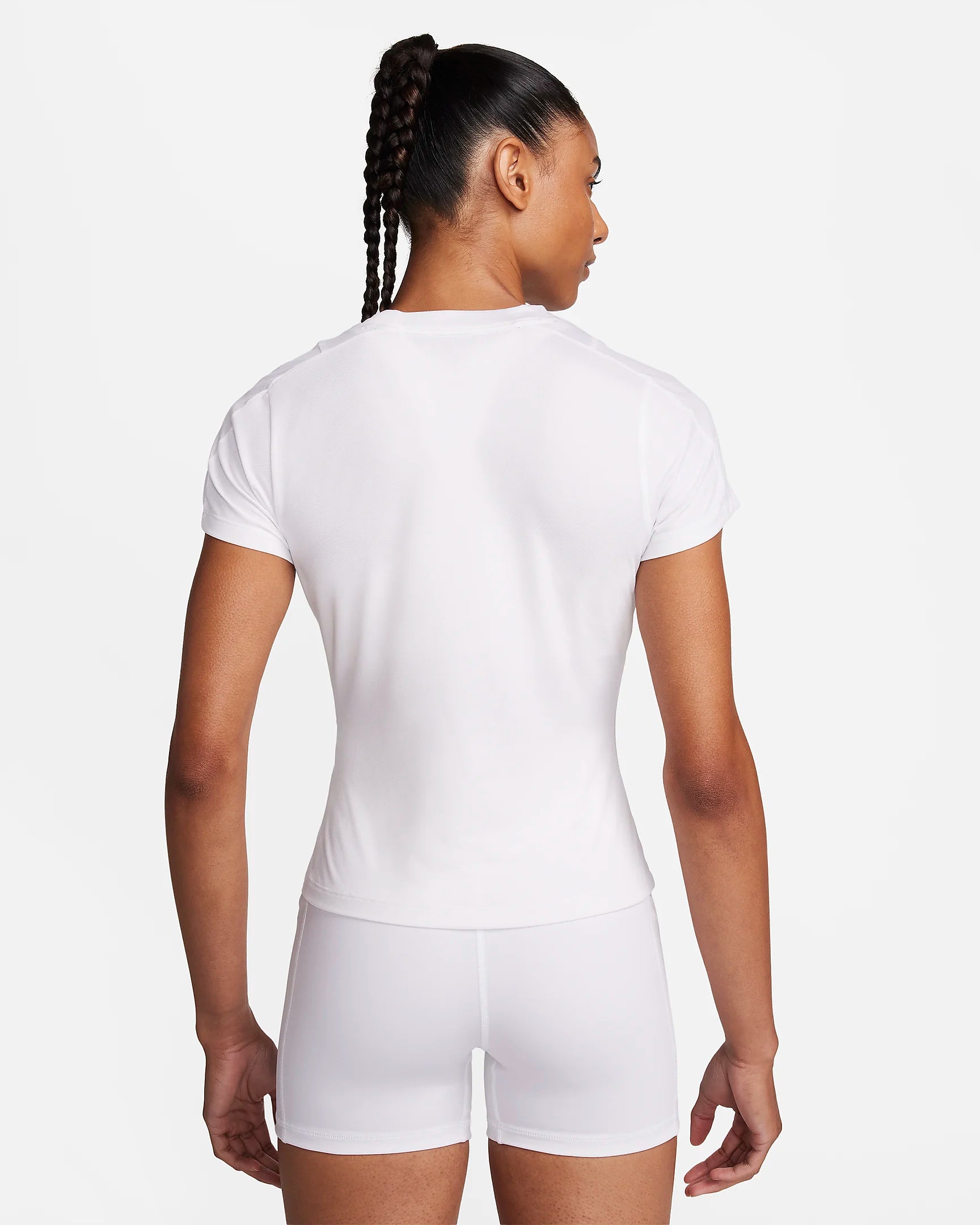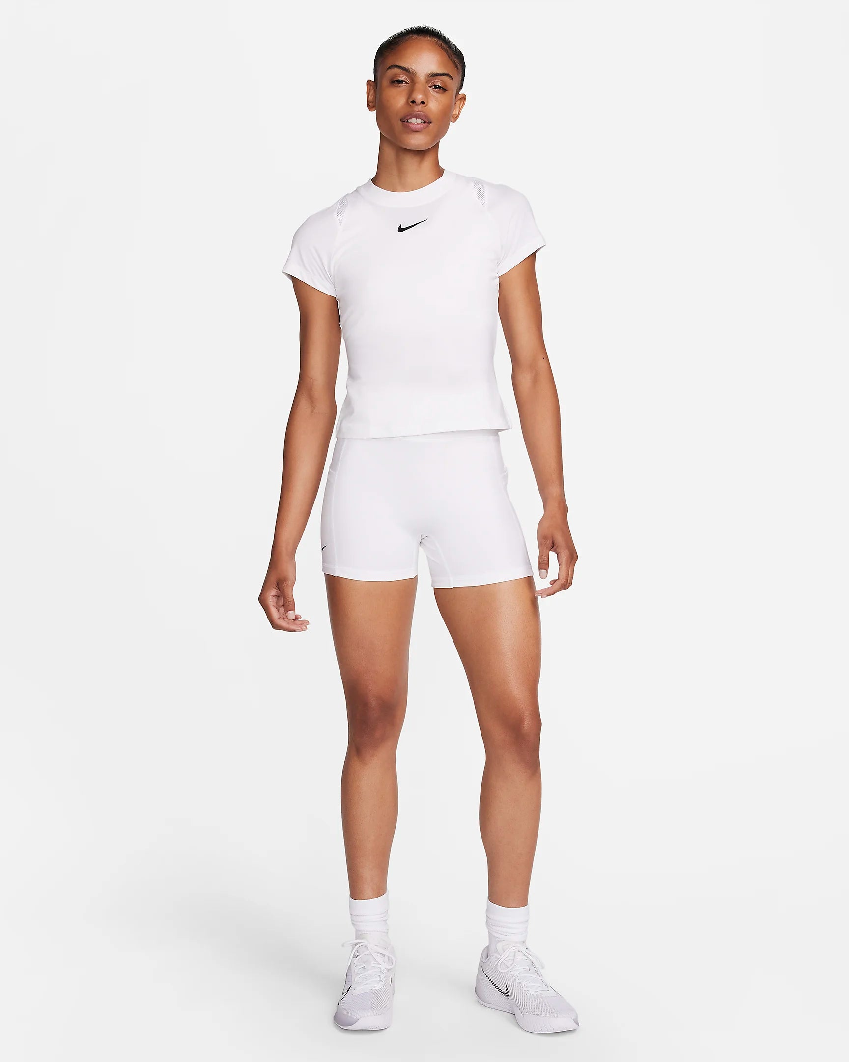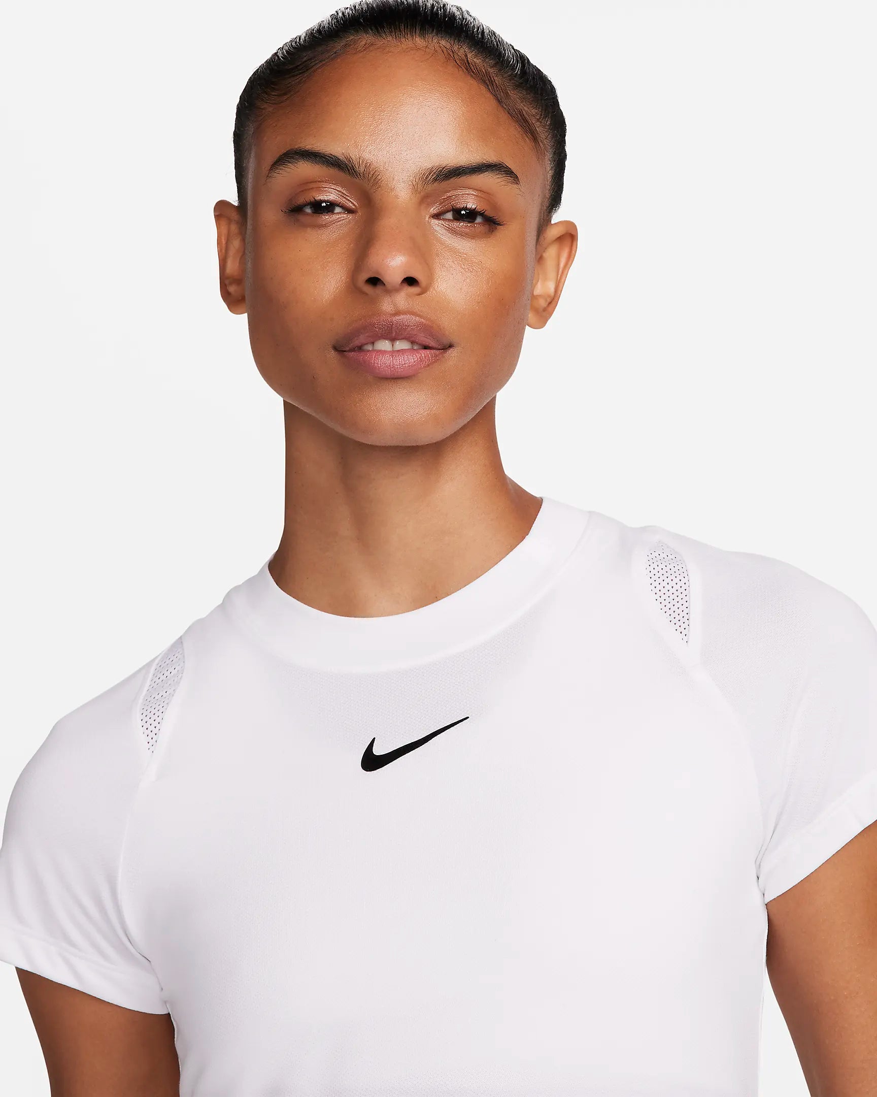 Take advantage of comfort and style as you sport this slim-fitting top. The sweat-wicking tech helps keep you dry while mesh panels at the collarbone offer extra airflow. Made for all of your stances, the high neckline and lightweight, stretchy fabric help keep you covered and free to make all the dynamic moves you need to.
