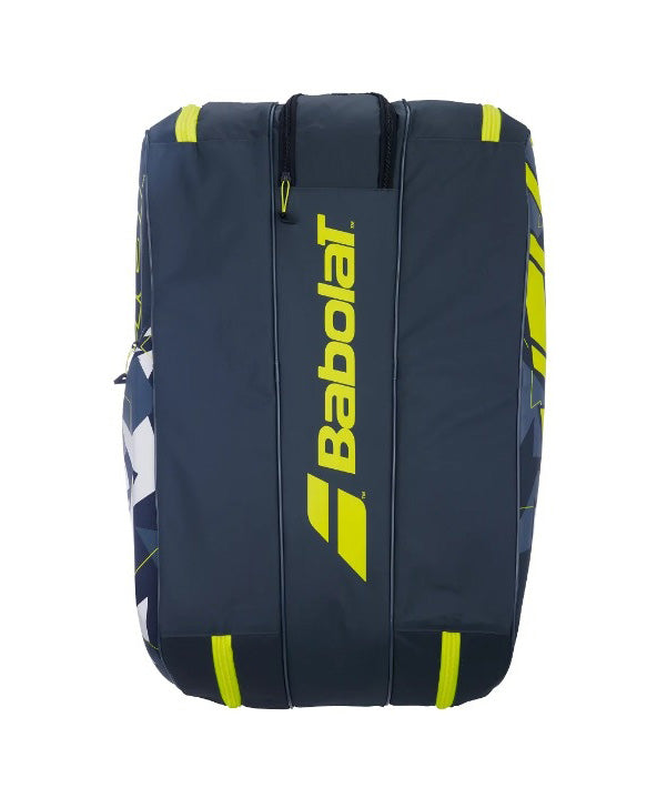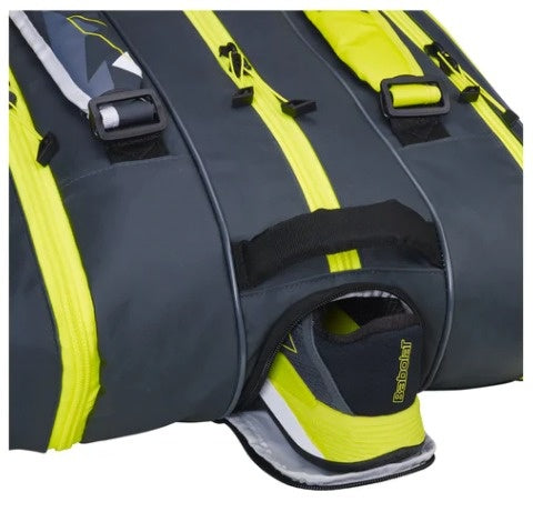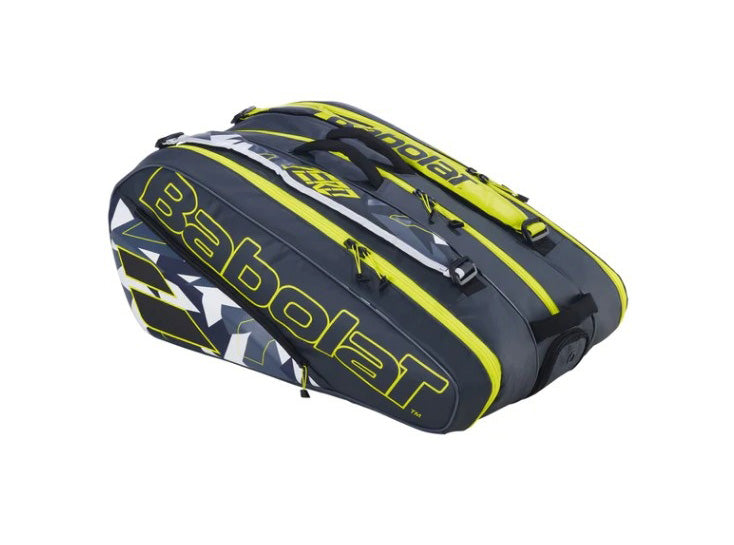 The Babolat RH12 Pure tennis bag sets the standard with its disruptive design and variety of features. We've created a new more ergonomic and hard-wearing version of the RH12 Pure Aero. With 3 compartments, the RH12 is the biggest bag in the Pure Aero range. The main compartment can hold up to 6 racquets, plus all the accessories you need to shine on the court. The other 2 compartments (for 2 and 4 racquets) are insulated to protect your strings from temperature fluctuations.